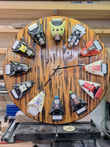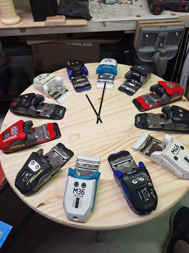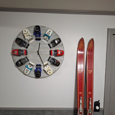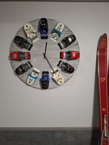 Our ski binding clock will make a great addition to your ski lodge, mancave or garage. Definitely a conversation piece that will spark memories of days on the slopes spent with close friends. Made of various new and vintage bindings no two are alike. We can custom design these by manufacturer or color etc. If you prefer we can use your old bindings too! (Better yet have us turn your skis into a chair or coat rack!) We can also mix bindings and ski pole baskets if you like.